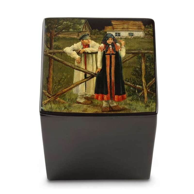 A Russian Lacquer Box "Couple at the Fence" Vishnyakov & Sons, Ostashkovo, ca. 1880