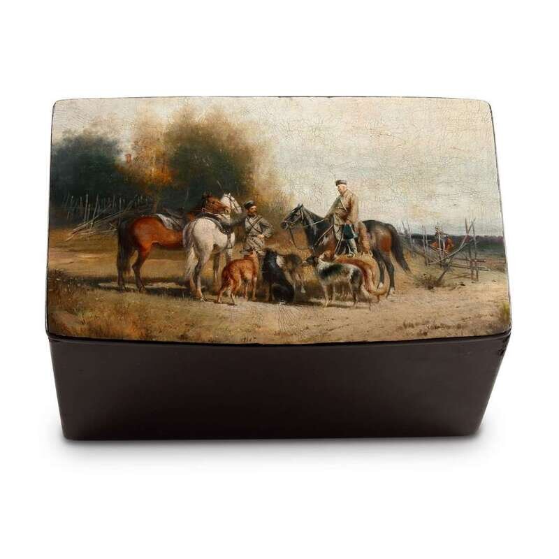 A Russian Lacquer Box "At the Hunt with Borzoi" Apparently unsigned, likely Moscow, ca. 1890