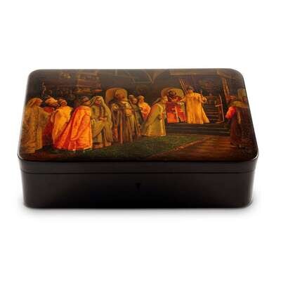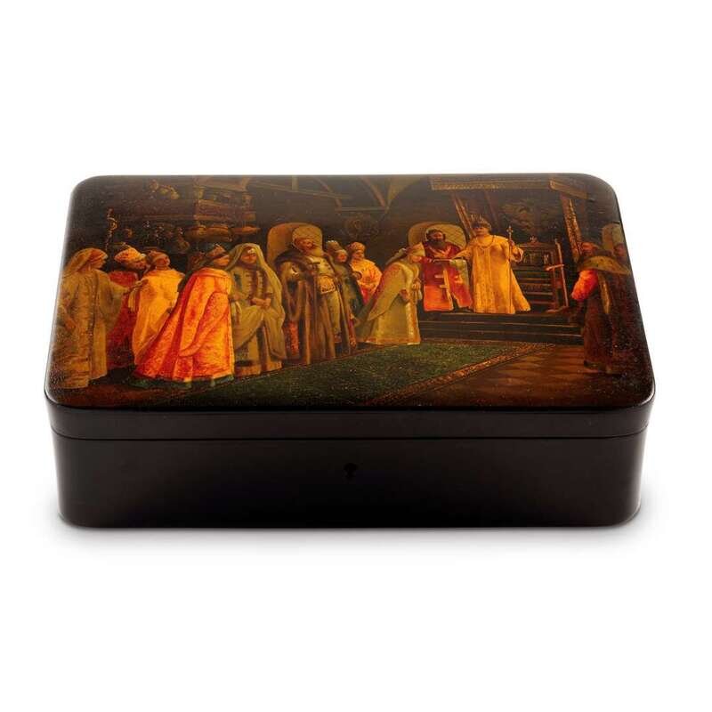 A Russian Lacquer Casket after Makovsky's "Choosing a Bride" Vishnyakov & Sons, Ostashkovo, ca. 1890