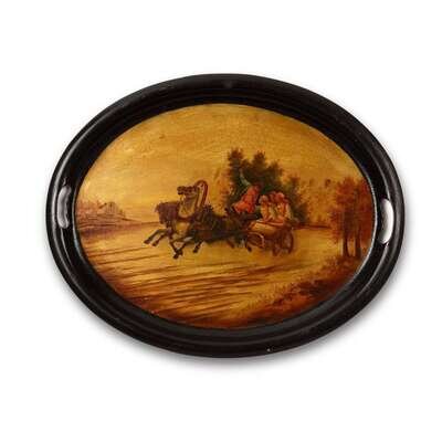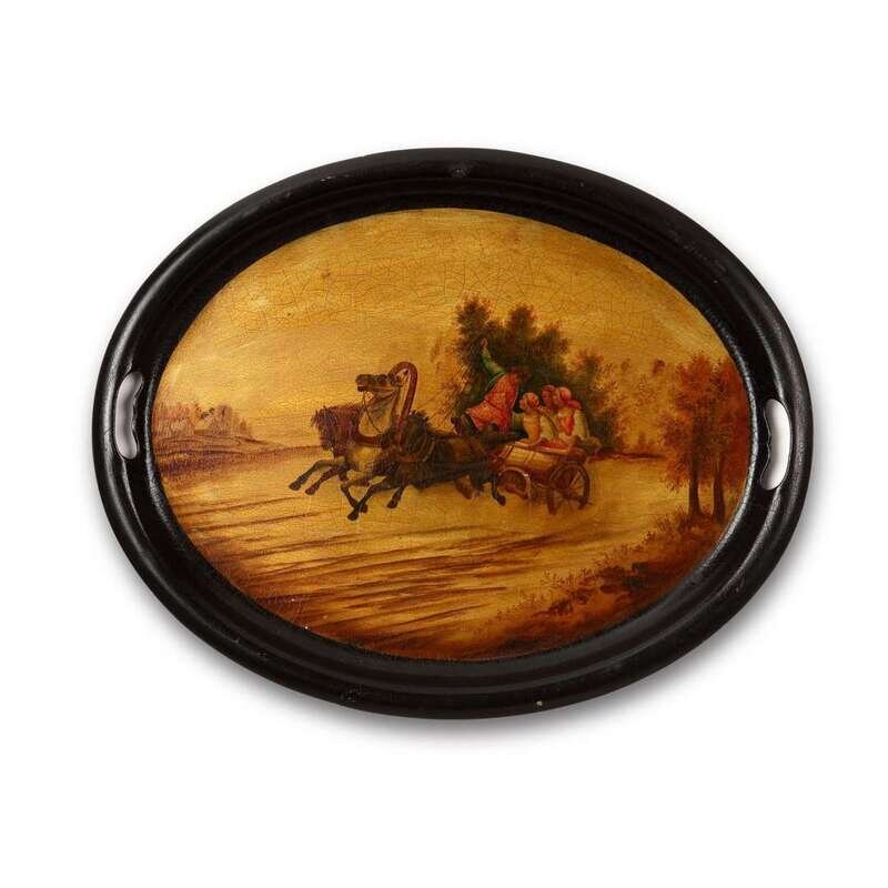 A Russian Lacquered Tole Two-Handled Tray "Autumn: A Troïka Ride" Unknown Workshop, Likely Moscow, ca. 1900