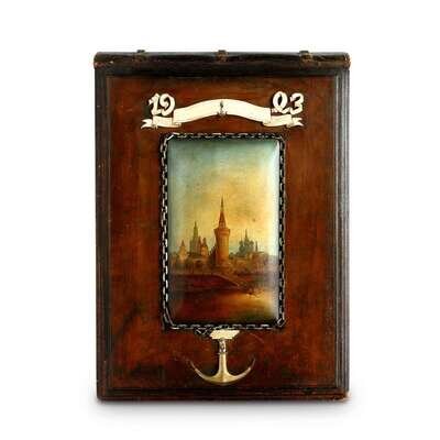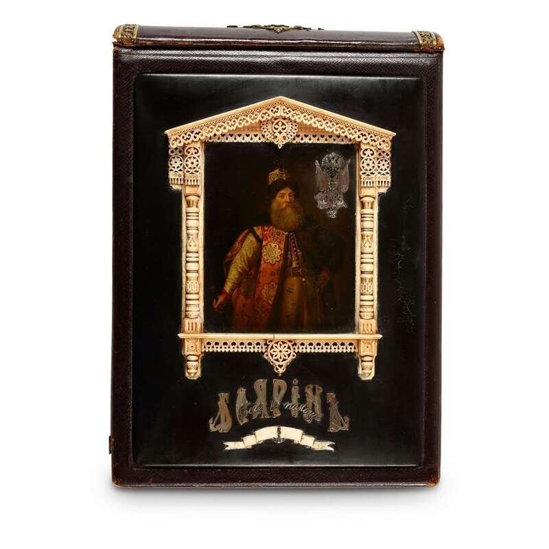 Rectangular, and leather covered, the case mounted with a bone caving in the form of an isba wondow, centering a lacquer miniature portrait of Boyar Pyotr Potemkin aftre the portrait by Sir Godfrey Kneller, the cover also with silver mounts reading in Russian "Boyarin: God Will Assist" above ribbons and anchors, opening to reveal a leather bound photo album with the date "1903" carved in bone and a silver anchor and chain surrounding a lacquer miniature painting of a view of the Beklemishevskaya Tower of the Kremlin from the Moscow Bridge, the interior pages painted with watercolor borders by various artists.