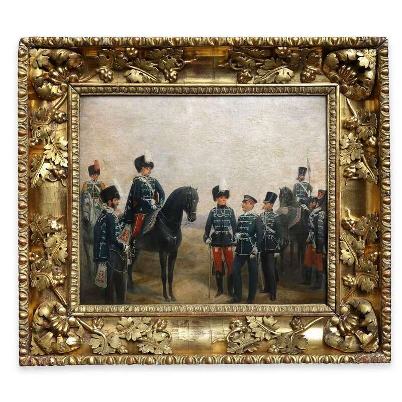 A Russian Lacquer plaque in a Giltwood Frame "Hussars" Attributed to Vishnyakov & Sons, Ostashkovo, circa 1880