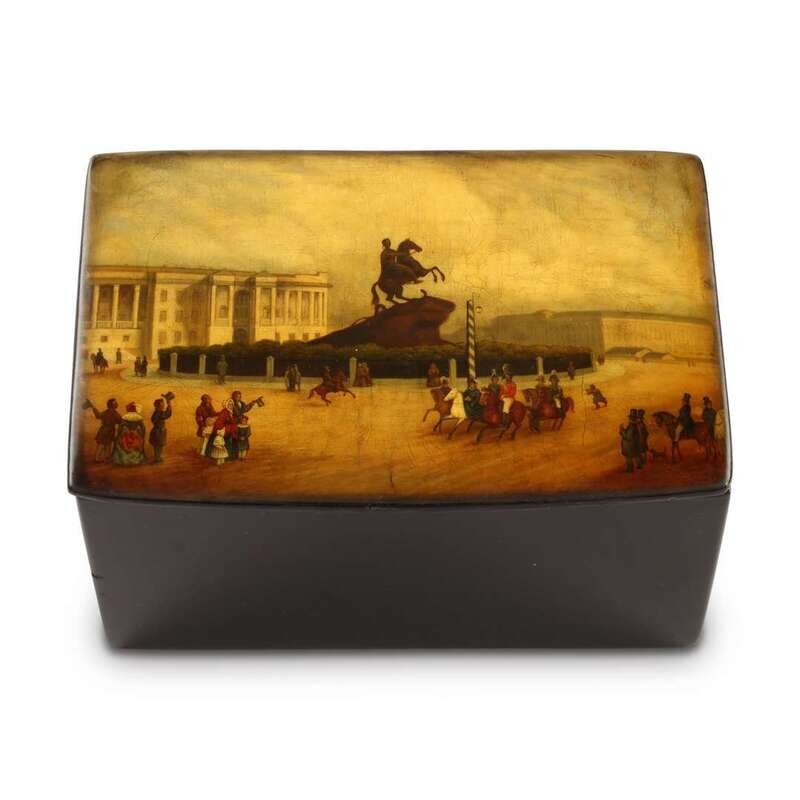 A Russian Lacquer Casket after Petersen’s engraving “Senate Square, St Petersburg, with Falconet's Statue of Peter the Great” Vishnyakov & Sons, Ostashkovo, ca. 1870-1880