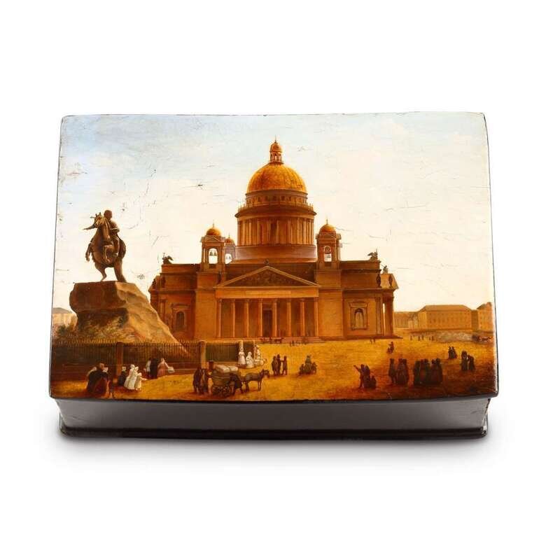 A Russian Lacquer Box After Vorobyov's "St Isaac's Cathedral and the Bronze Horseman" Lukutin Factory, Fedoskino, ca. 1888-1902