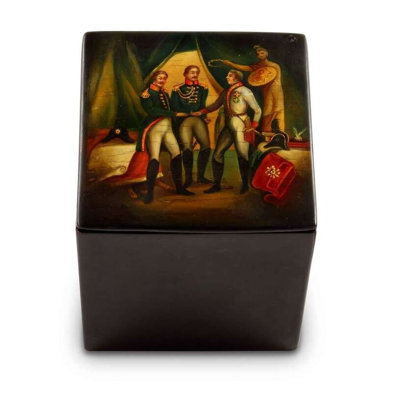 A Russian Lacquer Box "Fame Crowning Peter the Great and his Generals" Vishnyakov & Sons, Ostashkovo, ca. 1880