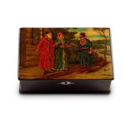 A Russian Faux-Lacquer Tole Peinte Box "The Toasting of the Boyar Betrothal" Alexey Gubkin & A. Kuznetsov. Moscow, Ca. 1890