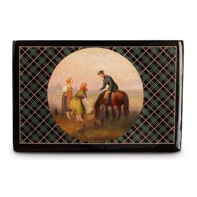 A Russian Shotlandka Ground Lacquer Tobacco Box "War of 1812: Gifts for the Soldiers" Vishnyakov & Sons, Ostashkovo, ca. 1880-1890