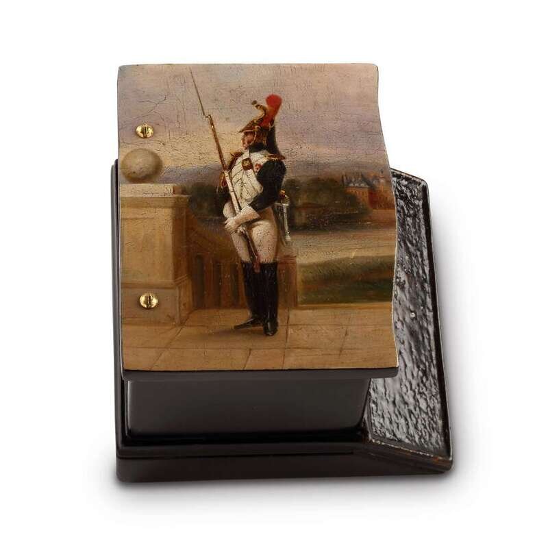 A Russian Lacquer Matchbox with strike "On Guard" Lukutin Manufactory, Fedoskino, ca. 1848-1863