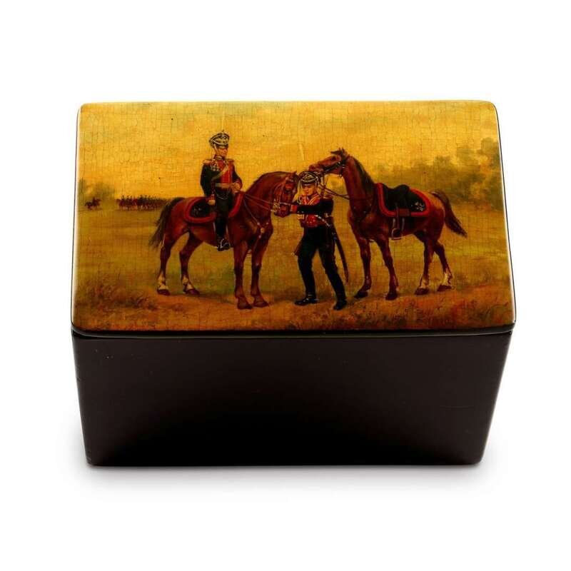 A Russian Lacquer Box “Officers on the Field” Vishnyakov & Sons, Ostashkovo, ca. 1877-1880