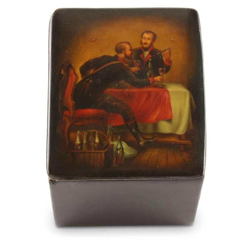 A Russian Lacquer Box “Officers Celebrating: Drinking Champagne” Vishnyakov & Sons, Ostashkovo, ca. 1870