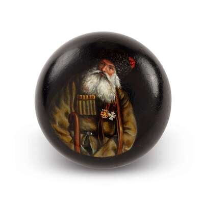 A Russian Lacquer Tobacco Box "Cossack with the Orders of St Vladimir & St. George" Vishnyakov & Sons, Ostashkovo, ca. 1870-1880