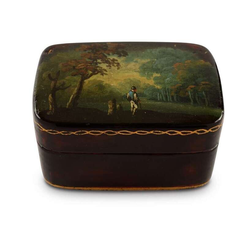 A Russian Lacquer Box “Figure in a Rural Landscape” Vishnyakov & Sons, Ostashkovo, ca. 1865-1870