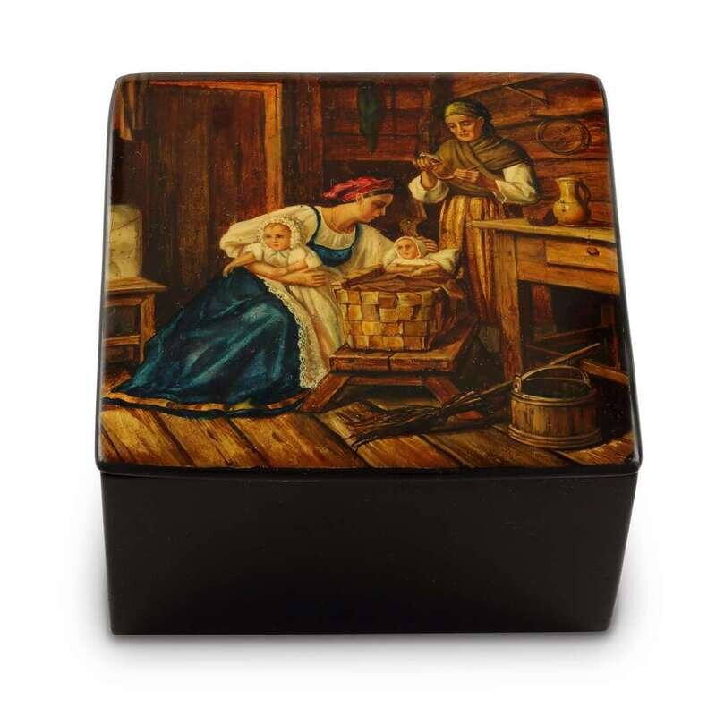 A Russian Lacquer Square Box "Mothering." vishnyakov & sons, ostashkovo, ca. 1870