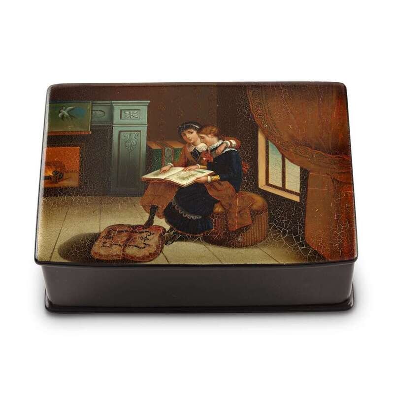 A Russian Lacquer Box “Learning the Alphabet” Lukutin Factory, Fedoskino, ca. 1896-1902