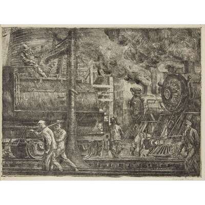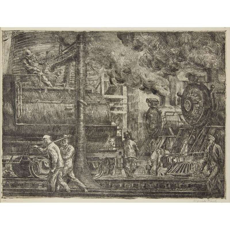 REGINALD MARSH (AMERICAN 1898-1954) "ERIE R.R. LOCOS WATERING"