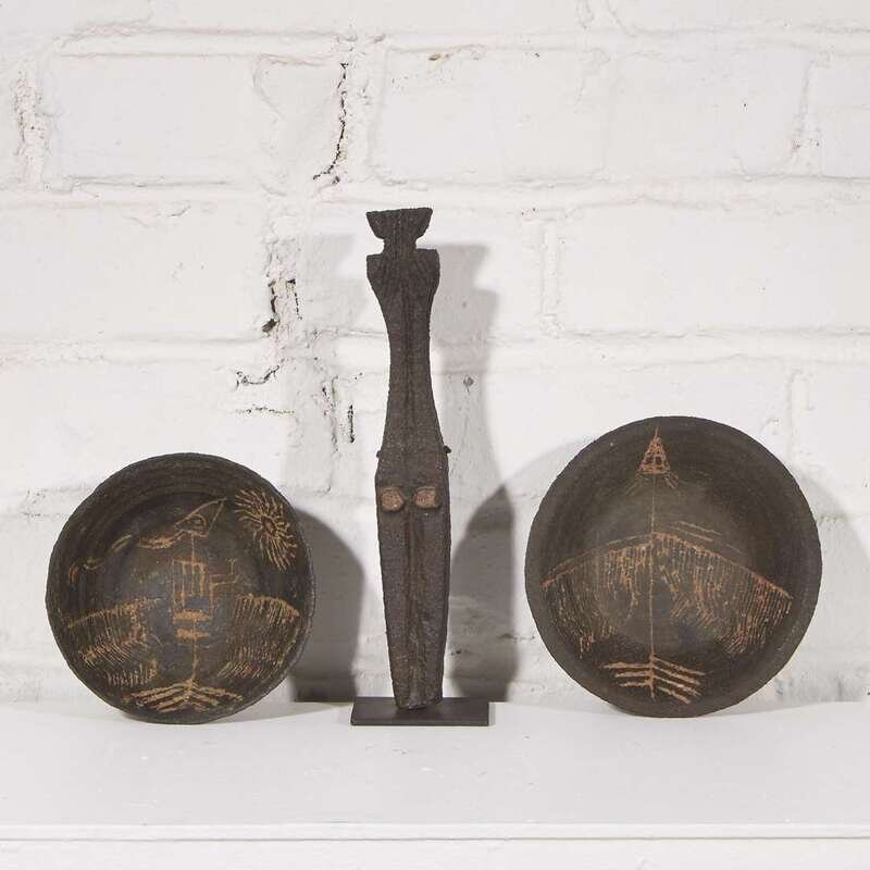 Earthenware with manganese glaze Figure with metal stand Bowls with applied paper labels numbered: "38" and "39" corresponding to gallery price list.