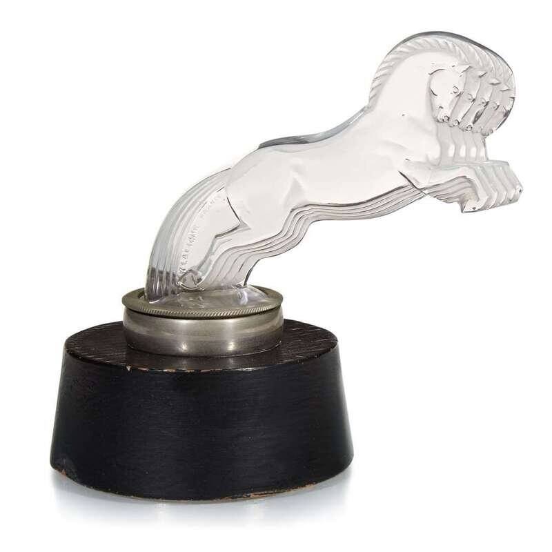Clear and frosted glass, nickeled metal, ebonized wood Molded block signature: "R. LALIQUE" Engraved: "FRANCE" Engraved: "No. 1122" to underside of horse.