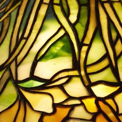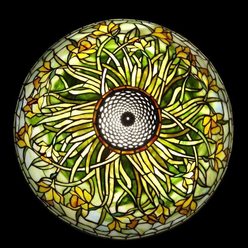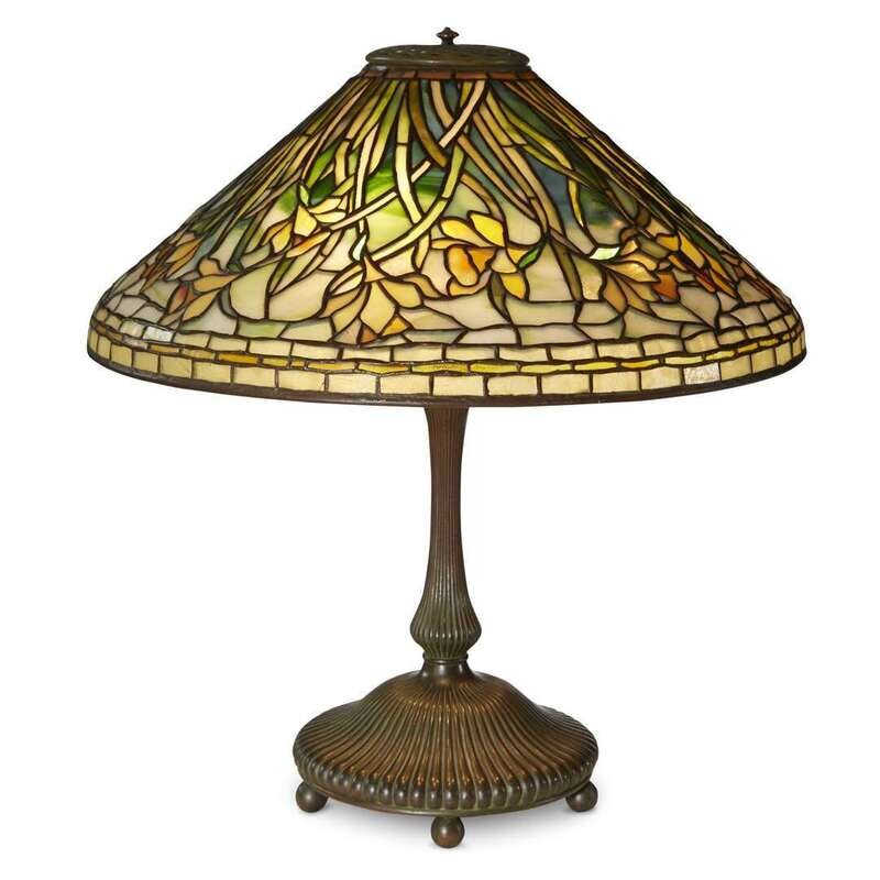Leaded glass, patinated bronze Shade with applied tag: "TIFFANY STUDIOS NEW YORK" Base impressed: "TIFFANY STUDIOS NEW YORK 9509"