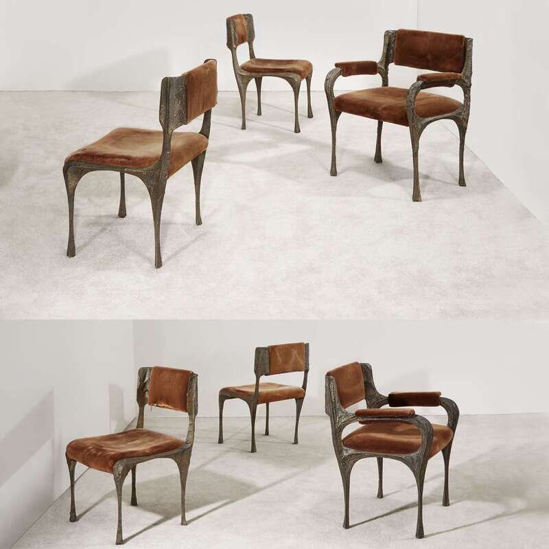 PAUL EVANS (AMERICAN, 1931-1987) SET OF SIX SCULPTURED METAL DINING CHAIRS MODEL PE-105 AND PE-106, USA