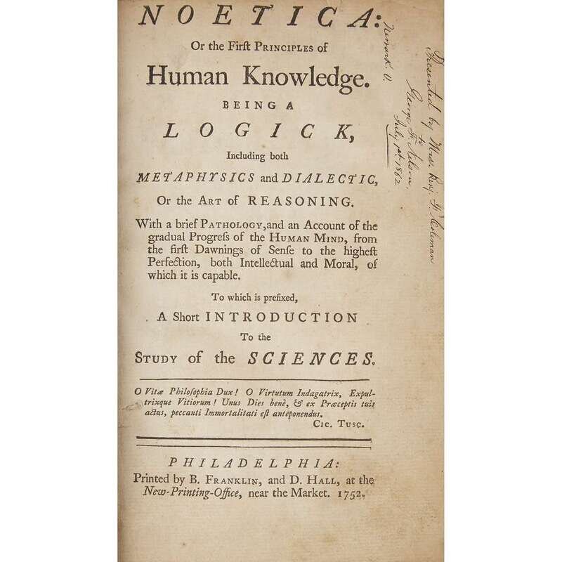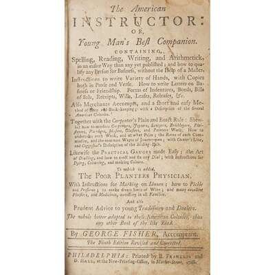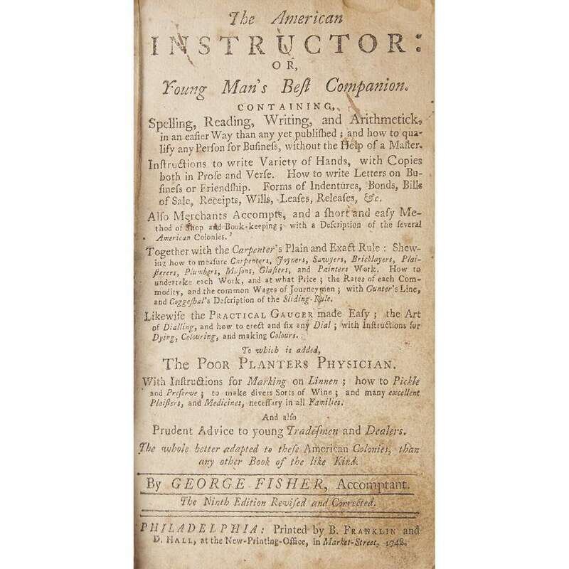 Fisher, George The American Instructor: Or, Young Man's Best Companion... Philadelphia: B. Franklin and D. Hall, 1748. 12mo. Original blind-paneled sheep. Defective copy, lacking some plates. Miller 439; Evans 6238. Johnson, Samuel [Elementa Philosophica] Philadelphia: B. Franklin and D. Hall, [1752]. 8vo. Lacking general title-page and last three leaves. 19th century three-quarter morocco over cloth-covered boards. Miller 554; Evans 6859. Sold with all faults.
