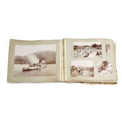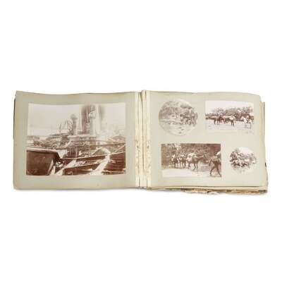 Large oblong folio. 96 original gelatin silver prints mounted on 22 leaves of cardboard stock. Most of the large and middle format photos bear the "1898 Copyright by W. R. Hearst" blind stamp. The photo-free recto of the first leaf displays several ink presentation inscriptions and other notations dated from November 1898 to October 1931.