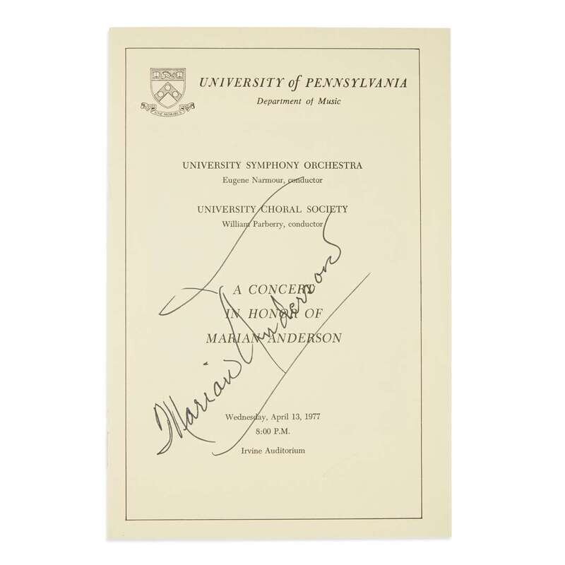 University of Pennsylvania, Department of Music... A Concert in Honor of Marian Anderson... April 13, 1977. (Philadelphia), (1977). 4to. Original printed self wrappers, (10) pp. Near Fine+. Signed in blue ink on front self wrapper. Strong, bold, dark signature.