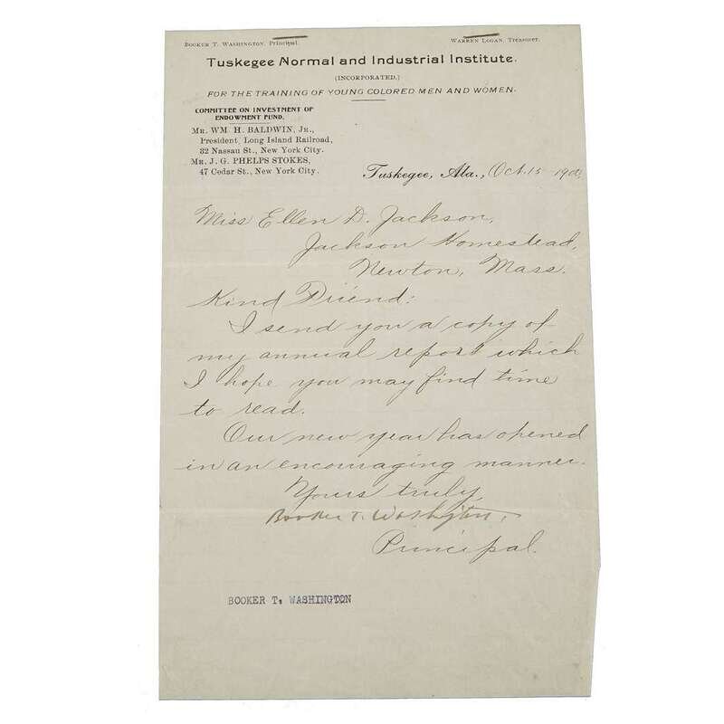 Tuskegee, October 15, 1900. 1 p. 4to. On Tuskegee Institute letterhead. To Miss Ellen D. Jackson, Jackson Homestead, Newton, Massachusetts, "...I send you a copy of my annual report..."