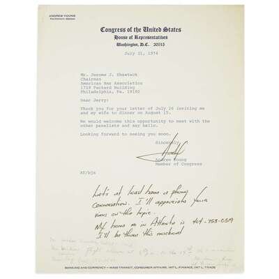 Washington, July 31, 1974. 1 p., 4to. To Mr. Jerome J. Shestack, Chairman, American Bar Association, responding to a dinner invitation, and with autograph post script, "Let's at least have a phone conversation. I'll appreciate your views on the topic. My home no. in Atlanta is..." Signed as U.S. Congressional representative on Congress of the United States letterhead.