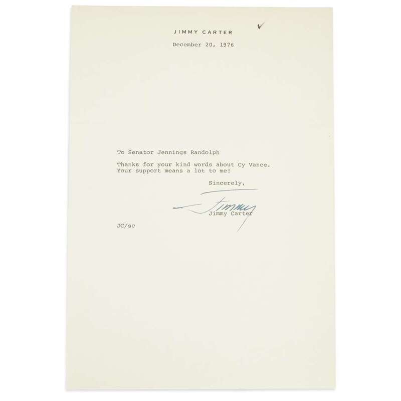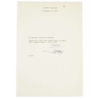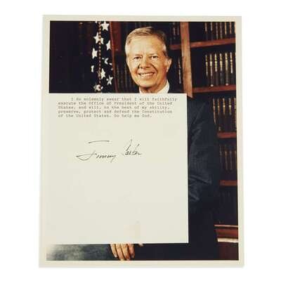 Autograph signature on typed transcript of the Presidental oath of office. Strong signature on clean, crisp small 4to sheet. Short typed letter signed. No Place, December 20, 1976. 1 p., 4to. As President elect to Senator Jennings Randolph, "Thanks for your kind words about Cy Vance. Your support means a lot to me!" Strong autograph signature, "Jimmy," in blue ink. Clean and crisp. Lot also includes a photograph of Carter.