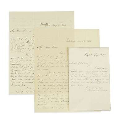Autograph letter signed. Washington, May 26, 1840. 2 pp. on one 4to sheet. To his cousin Mrs. Ann L. Dixon. Clear body and strong signature, "Millard," in blue ink. Autograph letter signed. Buffalo, May 30, 1844. 2 pp. on one 4to sheet. To his cousin Mrs. Ann L. Dixon, "...By the by you perceive I was right in saying that I should not be nominated for Vice President. You must not however infer that I am disappointed or low spirited. On the contrary I am in good health and fine spirits; confident of the sweep of the Whig cause, and rejoicing at the benefits which the country will derive from it..." Clear, strong body and signature, "Millard Fillmore." Autograph letter signed. Buffalo, Feb. 8, 1860. 1 p., 12mo. To an unknown correspondent, "I have now used your new device or 'eraser' long enough to be satisfied that it is the best thing of its kind which has fallen under my observation..." Clear, but a little light body and signature, "Millard Fillmore."