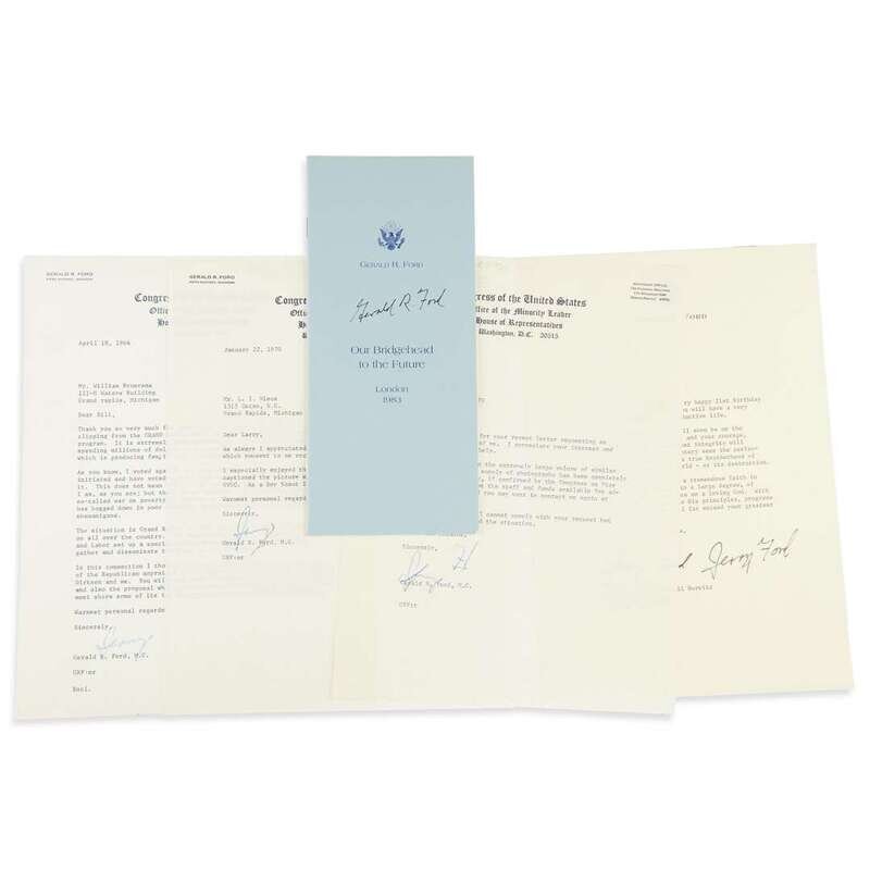 Typed letter signed. Washington, April 18, 1966. 1 p., 4to. To Mr. William Broersma [on the job training program in Grand Rapids, Michigan], "...It is extremely disappointing to realize that we are spending millions of dollars on a so-called anti-poverty program which is producing few if any results..." As Minority Leader of U.S. House of Representatives on Congressional letterhead. All clean and clear, signed "Jerry." Short typed letter signed. Washington, January 22, 1970. 1 p., 4to. As Minority Leader of U.S. House of Representatives on Congressional letterhead. All clear and clean, signed "Jerry." Our Bridgehead to the Future Pamphlet signed. London, 1983. Tall 12mo, original stapled printed blue wrappers. Signed, "Gerald R. Ford" on front wrapper in strong, dark blue ink. Lot also includes typed letter with autopen signature.
