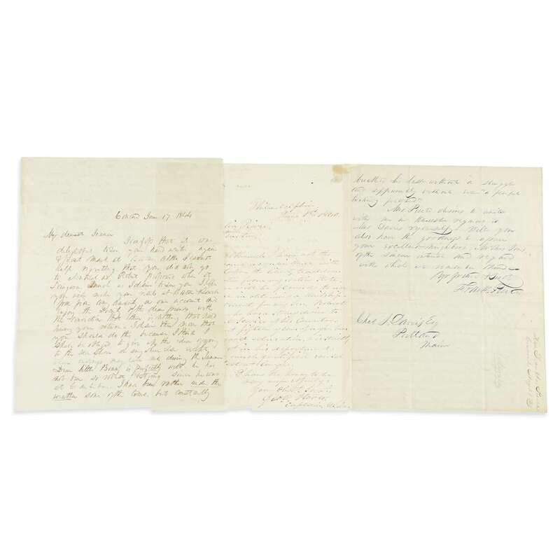 Autograph letter signed. Concord (New Hampshire), May 1, 1839. 4 pp., 4to. To Chas. S. Davis, Esq., reflecting on the life and character of his recently deceased father, Benjamin Pierce. Clear legible body, strong signature in blue ink traversed by a moderate vertical crease. Short autograph letter signed. Washington, Senate Chamber, June 2, 1840. As U.S. Senator from New Hampshire to James K. Paulding, Secretary of the Navy, expediting the naval appointment of 15 year old Robert Blunt Storer on the verso of a constituent's letter asking him (Franklin Pierce) to effectuate this appointment. All on one 4to sheet. Pierce's signature starting, in part, to fade. Autograph letter signed. Concord (New Hampshire), June 17, 1844. 2 pp., on one 4to sheet. To "My dearest Jennie" [his wife, Jane Appleton Pierce]. A tender letter of quotidian marital details. Clear body and signature, "Franklin."