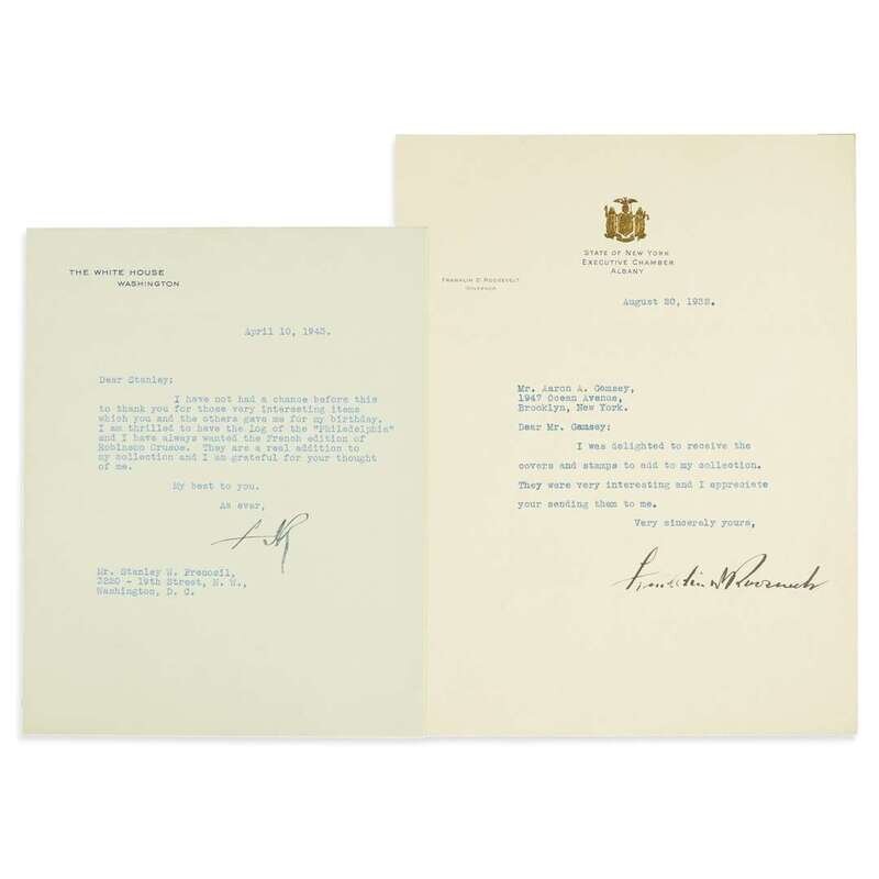 Short typed letter signed. Albany, August 20, 1932. 1p., 4to. As Governor of New York, to Mr. Aaron A. Gamsey, "I was delighted to receive the covers and stamps to add to my collection..." Clean and crisp, strong, dark signature. Typed letter initialed. Washington, April 10, 1943. 1 p., 4to. As President of the United States, on White House letterhead on blue-green paper stock, to Mr. Stanley W. Prenosil, [thanking the recipient and his associates for their birthday gifts] "...I am thrilled to have the Log of the 'Philadelphia' and I have always wanted the French edition of Robinson Crusoe..." Clean and crisp. Strongly and darkly initialed.