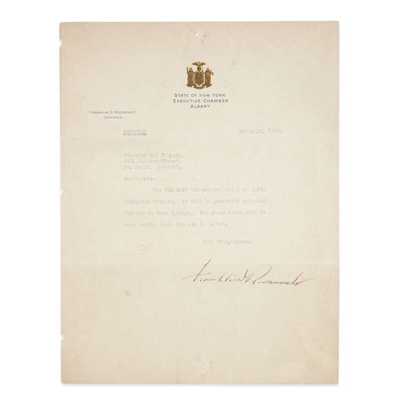 Albany, March 24, 1930. 1 p. 4to. To the Superior Hat Company - Personal, "The 'EX-RAY' hat arrived and I am quite delighted with it. It will be perfectly splendid for use in Warm Springs. The green visor will be most useful where the sun is so hot." Signed as Governor of New York on Executive Chamber letterhead. Strong, clear signature.