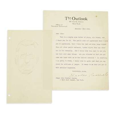 New York, December 23, 1910. 1 p., small 4to. On Theodore Roosevelt's The Outlook letterhead, to Judge John Proctor Clarke, "...The public does not appreciate what I know you do appreciate, that I hold the wise judge higher than all other public servents, indeed higher than any other man in the community. Now I would like very much to see you, and talk over some things..."