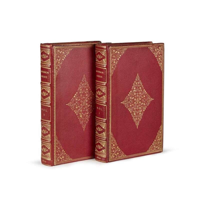 London: Printed for T. Cadell and W. Davis, 1820. 8vo. 19th century richly-gilt pebble grain red morocco, rebacked in 20th century richly-gilt pebble grain red morocco with emblematic gilt compartments, gilt turn-ins, all edges gilt, 20th century marbled endpapers. With 22 plates, including frontispieces, engraved by C. Heath after T. Stothard. In two volumes.