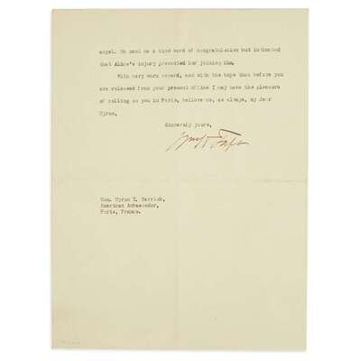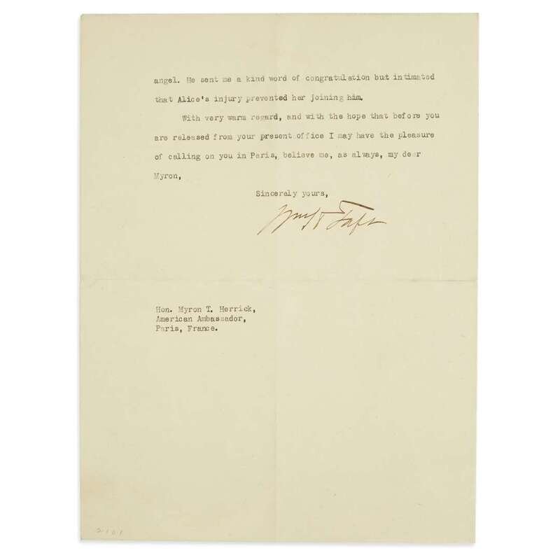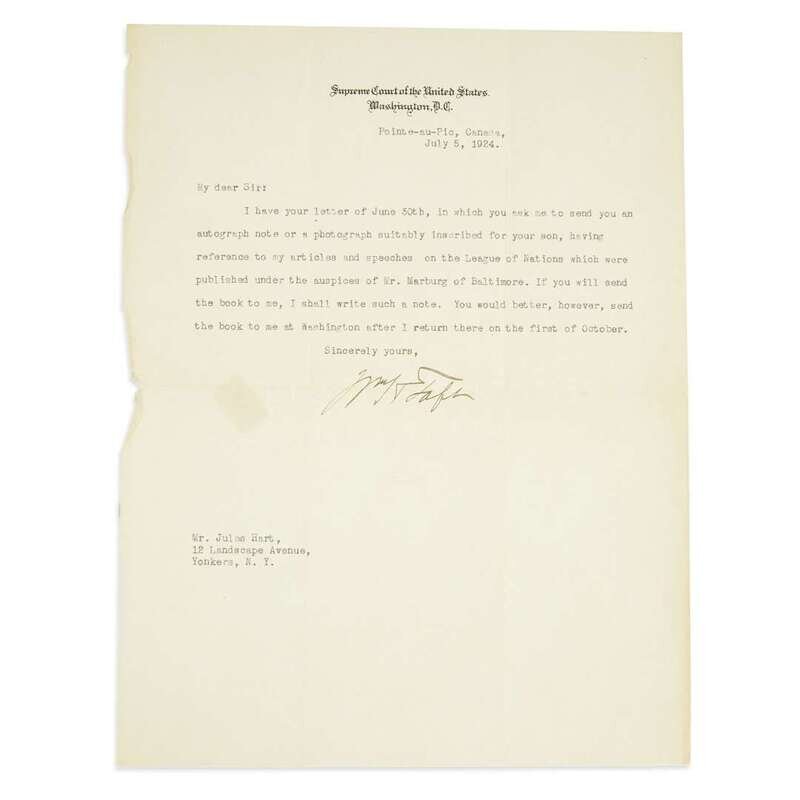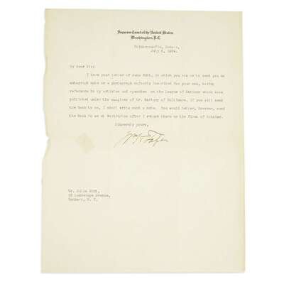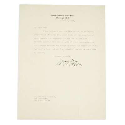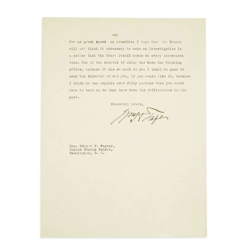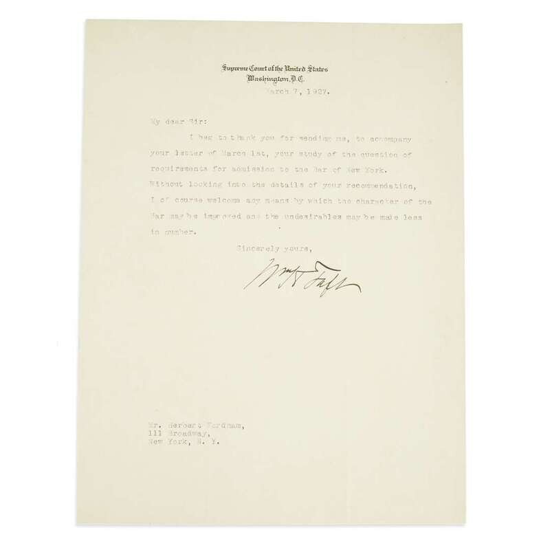 Pointe-a-Pic, P. Q., Canada, July 19, 1921. 2 pp., 4to. To Myron T. Herrick, Ambassador, Paris, France [responding to congratulations on assuming the office of Chief Justice], "...The task which I face is one of incessant labor and great responsibility, and I am concerned least I might not be able to meet exigency..." Pointe-au-Pic, Canada, July 5, 1924. 1 p., 4to. On Supreme Court letterhead, responding to a request for an autograph. Washington, March 7, 1927. 1 p., 4to. On Supreme Court letterhead, to Mr. Herbert T. Fordham, "...I of course welcome any means by which the character of the [New York] bar can be improved..." Washington, December 15, 1928. 2 pp., on two 4to sheets. On Supreme Court letterhead, to U.S. Senator Robert F. Wagner [addressing concerns relating to delays in producing the Supreme Courts official reports], "...The detail and care necessary in the preparation of these reports are hardly realized by the ordinary practitioner... I hope the that the Senate will not make an investigation in a matter the Court itself makes at every convenient time..."