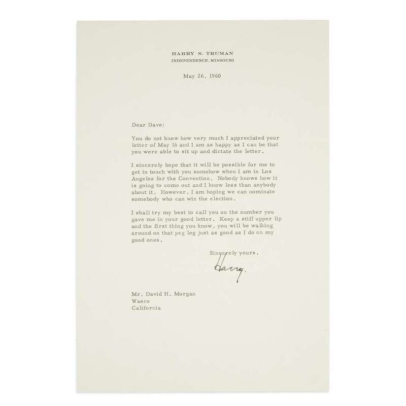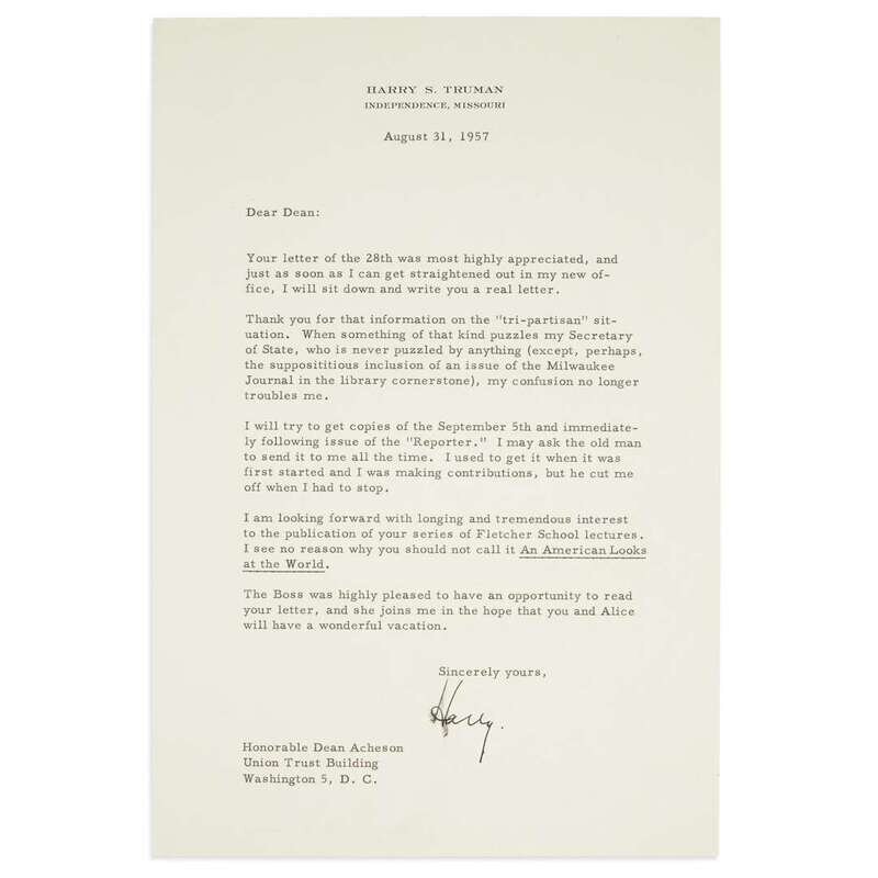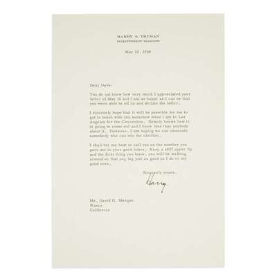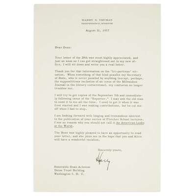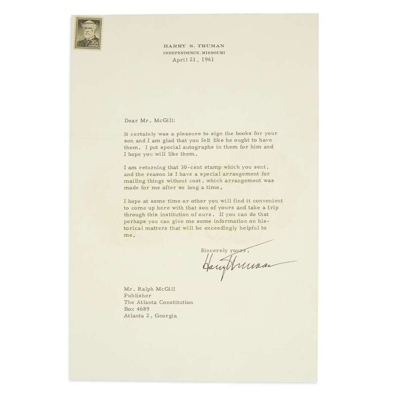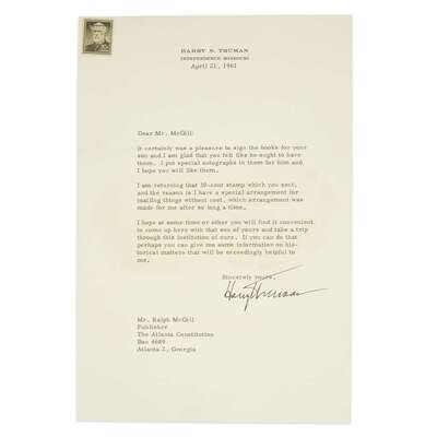 Independence, Missouri, August 31, 1957. 1 p., 4to. To Dean Acheson, "...Thank you for that information on the "tri-partisan" situation. When something of that kind puzzles my Secretary of State, who is never puzzled by anything... my confusion no longer troubles me... The Boss was highly pleased to have an opportunity to read your letter..." Independence, Missouri, May 26, 1960. 1 p., 4to. To David H. Morgan, "...I sincerely hope that it will be possible for me to get in touch with you when I am in Los Angeles for the Convention. Nobody knows how it is going to come out and I know less than anybody about it. However, I am hoping we can nominate somebody who can win the election..." Independence, Missouri, April 21, 1961. 1 p., 4to. To Ralph McGill, publisher, The Atlanta Constitution, "It certainly was a pleasure to sign the book for your son... I am returning that 30-cent stamp which you sent, and the reason is I have a special arrangement for mailing things without cost..." With an uncancelled 30-cent stamp stapled to the upper left corner of the letter sheet.