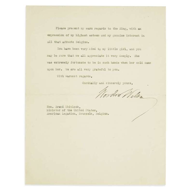 Paris, February 7, 1919. 2 pp., on two 4to leaves. As President of the United States, to Brad Whitlock, Minister of the United States, American Legation, Brussels, Belgium, "I am genuinely distressed to find that I cannot, before going back home, leave Paris long enough to make a visit to Brussels... My duties here exact every hour of me and, I hope, will be very much more helpful to Belgium than any visit I could make would be... You have been very kind to my little girl... She was extremely fortunate to be in such hands when her cold came upon her." Crisp and clean, Wilson's strong, dark signature traversed at its center by moderate horizontal crease.