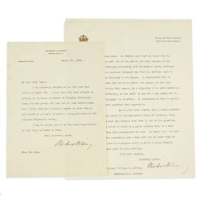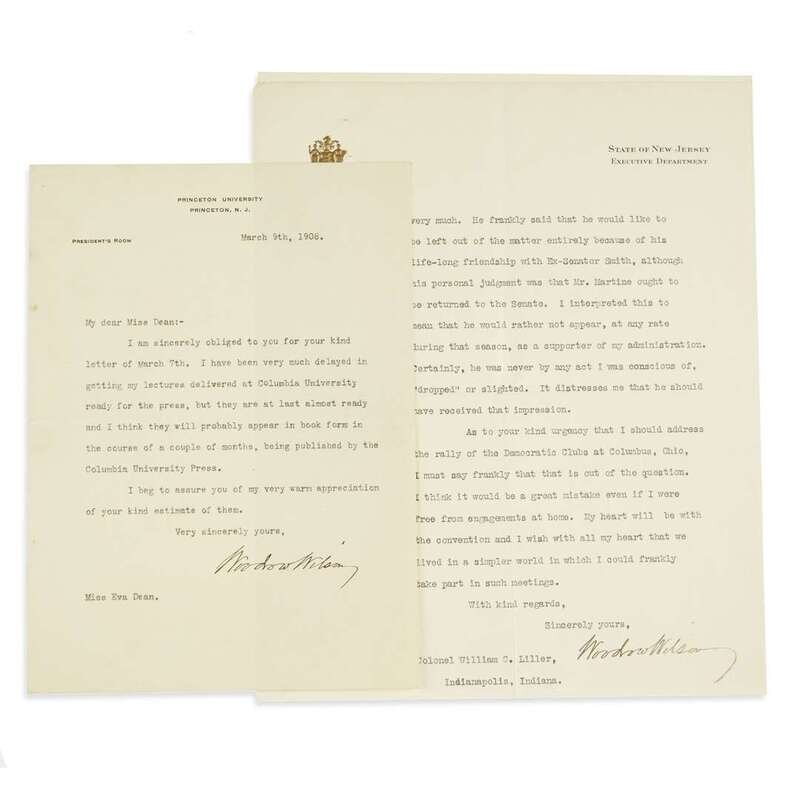 Princeton, March 9, 1908 - 1 p., small 4to. On Wilson's President's Room, Princeton University letterhead, to Miss Eva Dean, assuring her that the lectures delivered at Columbia University "...will probably appear in book form in the course of a couple of months, being published by the Columbia University Press..." Clear body, strong, dark signature. (No place), August 5, 1911 - 2 pp., on two 4to sheets. On State of New Jersey Executive Department letterhead, to Colonel William C. Liller on tactical political exigencies, including his (Wilson's) unintentional alienation of Judge Hudspeth. Clear body, generally strong signature.