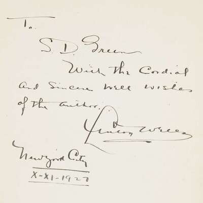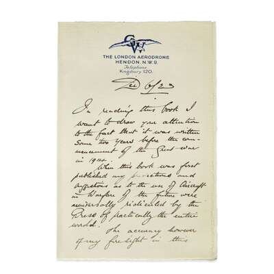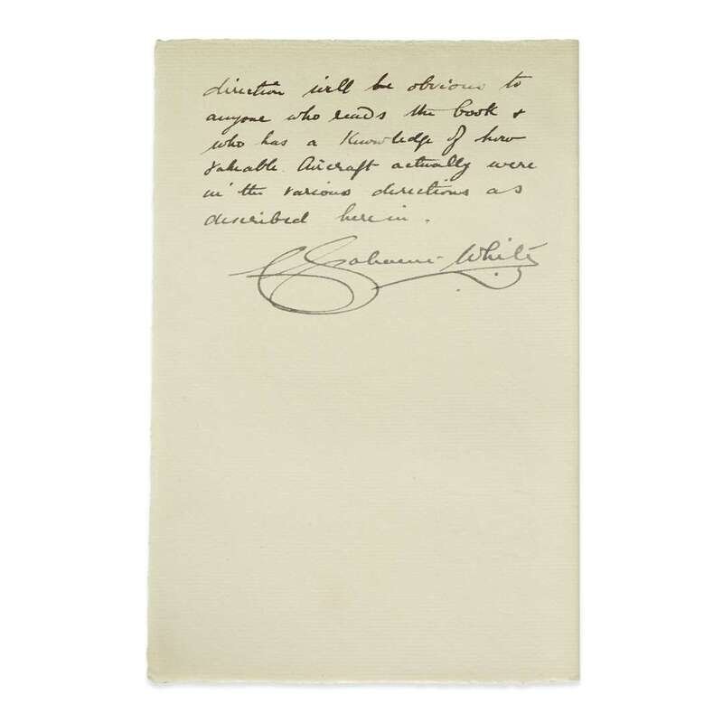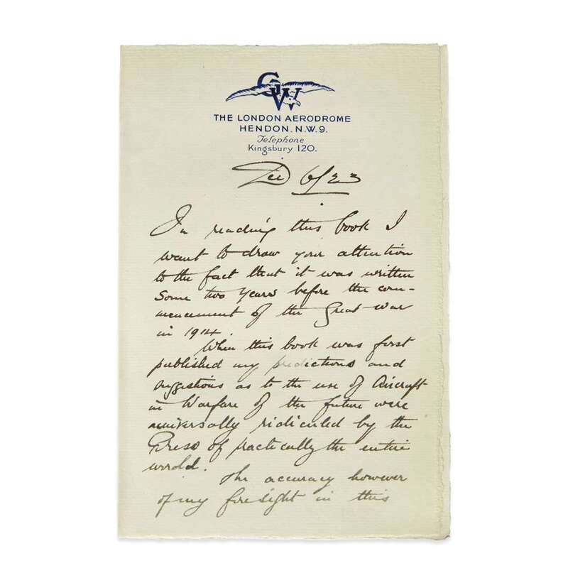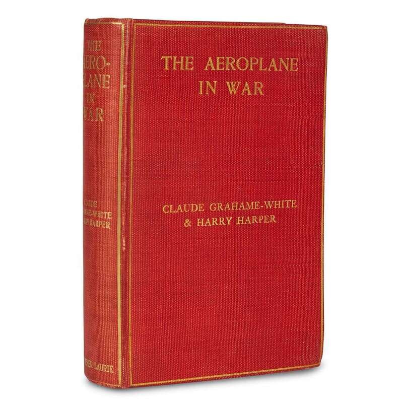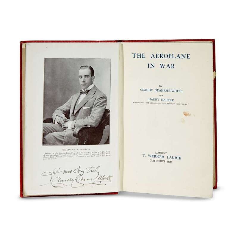 Grahame-White, Claude; Harper, Harry The Aeroplane in War London: T. Warner Laurie, [1912]. First edition. 8vo. Original gilt-paneled and gilt-lettered red cloth. With frontispiece portrait and 16 photo plates, 12 pp. publisher's advertisements at back. With Claude Grahame-White's book-plate on front paste-down. Frontispiece inscribed and signed by Claude Grahame-White in ink below image. And with 2 pp. Claude Grahame-White autograph letter signed on The London Aerodome letterhead, dated "Dec, 1923," laid-in. "When this book was first published my predictions... as to the use of aircraft in warfare of the future were universally ridiculed... The accuracy however of my foresight in this direction will be obvious to anyone who reads this book..." Mitchell, William Our Air Force, The Keystone of National Defense New York: E.P Dutton, (1921). 12mo. Original gilt-lettered blue cloth. Frontispiece and numerous other photo plates. Inscribed. Wells, Linton Around the World in Twenty-Eight Days Boston: Houghton Mifflin, 1926. First edition. 12mo. Original gilt-pictorial and gilt-lettered red cloth. Photo plates. Inscribed.
