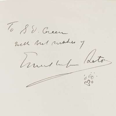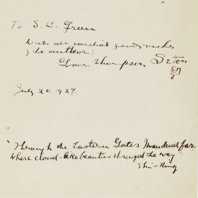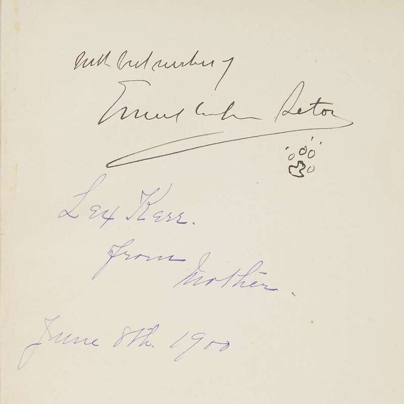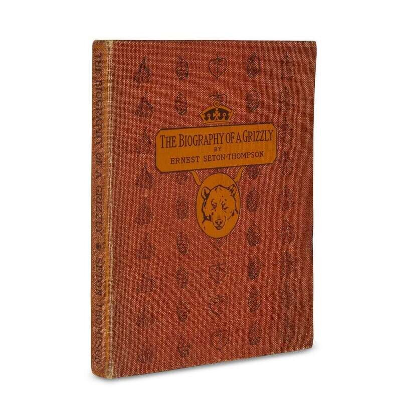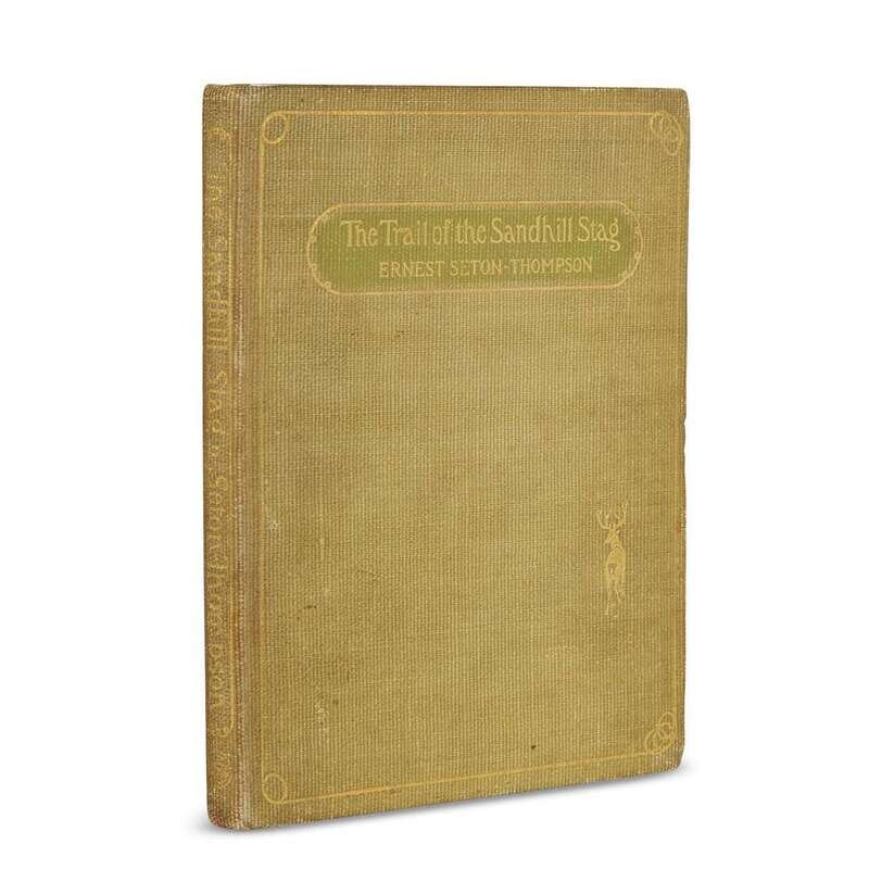 The Trail of the Sandhill Stag New York: Scribner's, 1899. First printing. Small 4to. Original gilt-pictorial olive-green cloth, top edge gilt, other edges untrimmed. With color frontispiece, full-page and other illustrations. Inscribed to S.D. Green, signed, and embellished with a small drawing of animal tracks, all in ink on front blank by Ernest Seton-Thompson. The Biography of a Grizzly New York: Century, 1900. First printing. Small 4to. Original pictorial russet cloth. With title vignettes, full-page illustrations (1 loose), other illustrations. Inscribed, signed, and embellished with a small drawing of animal tracks, all in ink on front free endpaper recto, by Ernest Seton-Thompson. Seton, Grace Thompson Chinese Lanterns New York: Dodd, Mead, 1924. Second printing. 8vo. Original color stamped pictorial orange cloth, top edge stained red, other edges untrimmed. With photo frontispiece and numerous photo plates. Inscribed to S.D. Green, dated "July 20, 1927," and signed in ink by Grace Thompson Seaton on front free endpaper recto.