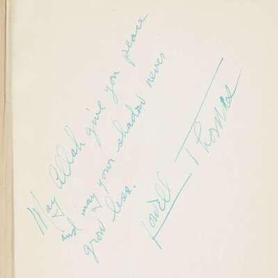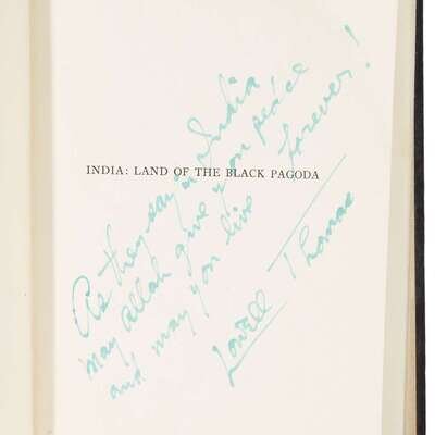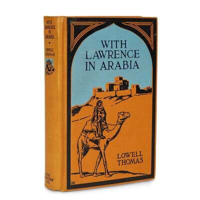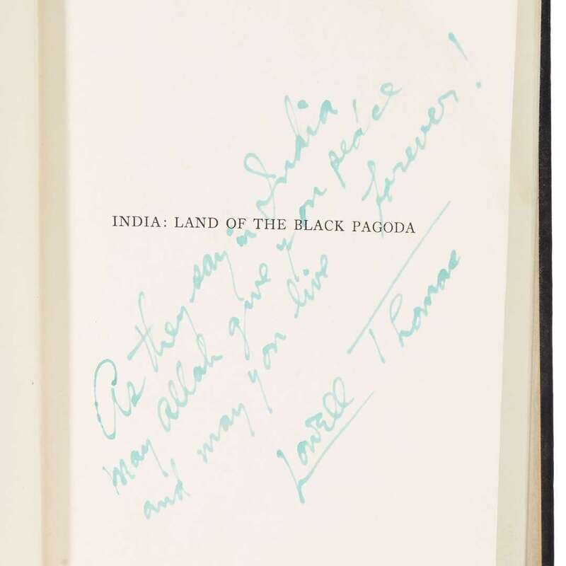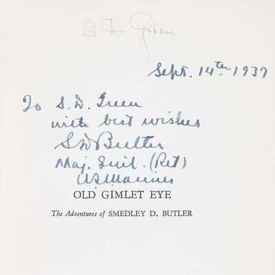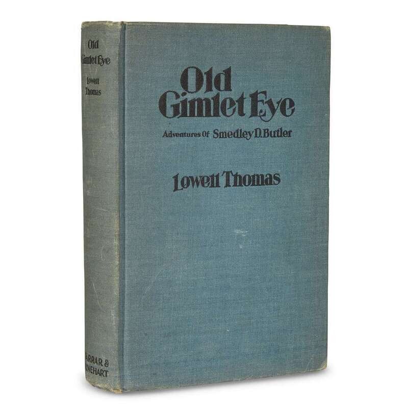 With Lawrence in Arabia New York: Century, (1924). 12mo. Original pictorial orange, blue, and black cloth. Frontispiece portrait of Lawrence, numerous photo plates. Inscribed and signed by Lowell Thomas in green ink on front free endpaper recto, "May Allah give you peace / and may your shadow never / grow less. Lowell Thomas." India: Land of the Black Pagoda New York: Century, (1930). First printing. 8vo. Original gilt-pictorial black cloth. Photo frontispiece, numerous photo plates. Inscribed and signed by Lowell Thomas in green ink on half-title. Old Gimlet Eye: Adventures of Smedley D. Butler New York: Farrar & Rinehart, (1933). 8vo. Original blue cloth. With frontispiece, full-page and other illustrations. Inscribed to S.D. Green, dated "Sept. 14, 1937," and signed in ink on half-title by Smedley D. Butler.