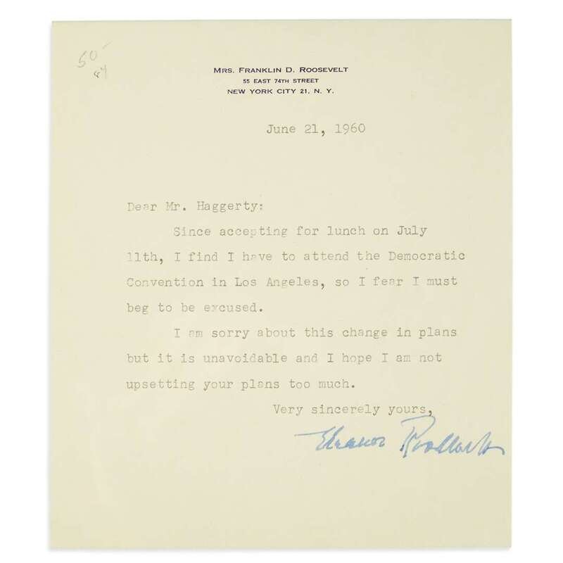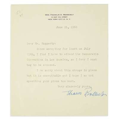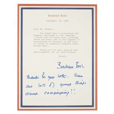 Bush, Barbara. No place, September 30, 1988. 1 p., small 4to. On her red, white, and blue bordered stationary. To Mr. Benson, "...one of the biggest [challenges of the Presidental campaign] is maintaining my serenity in the face of untrue or negative comments about George Bush..." Body clear. Stong signature with equally strong autograph post script. Roosevelt, Eleanor. (New York), June 21, 1960. 1 p., small 4to. On her Mrs. Franklin D. Roosevelt, 53 East 74th Street, NY, NY letterhead. To Mr. Haggerty, "Since accepting for lunch on July 11th, I find I have to attend the Democratic Convention in Los Angeles..." Clear body, strong signature. With photo portrait.