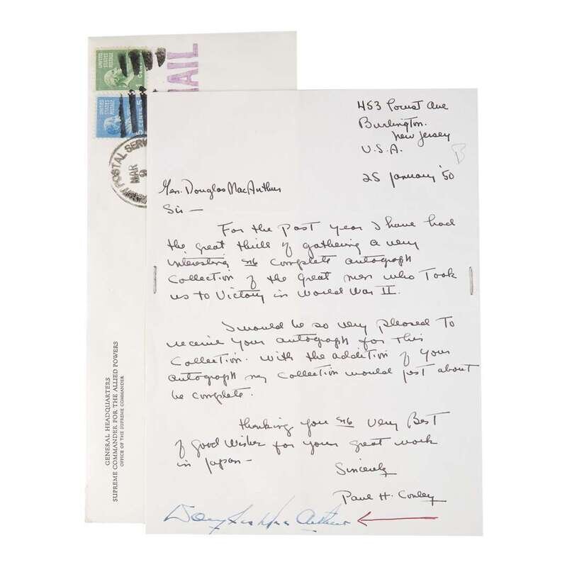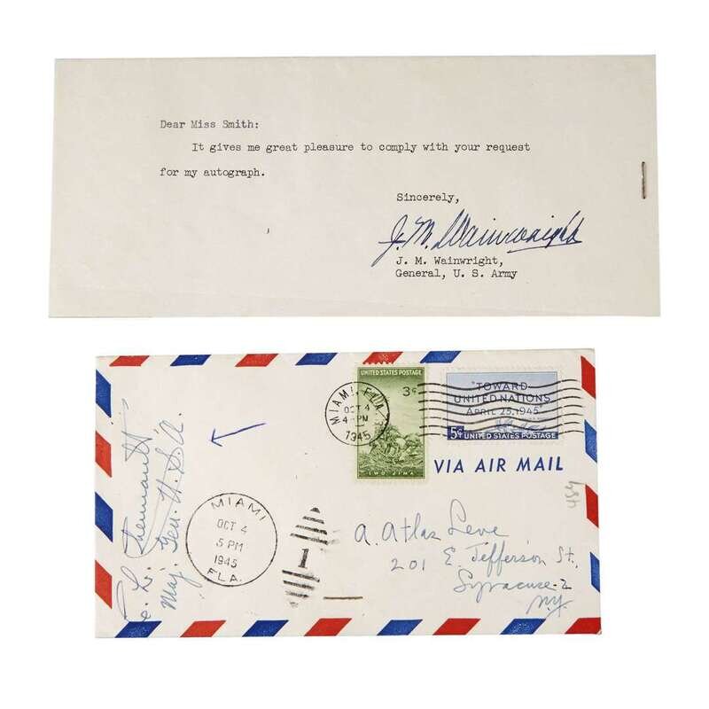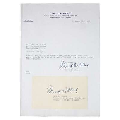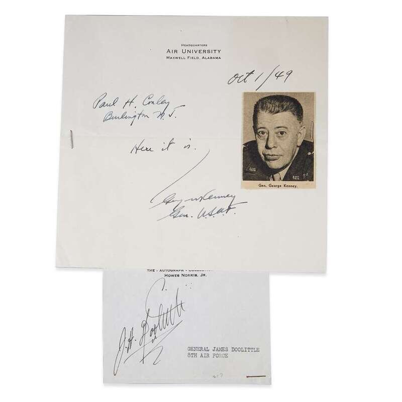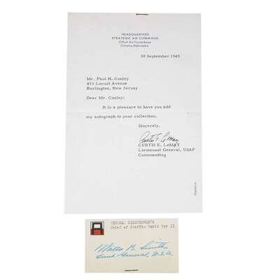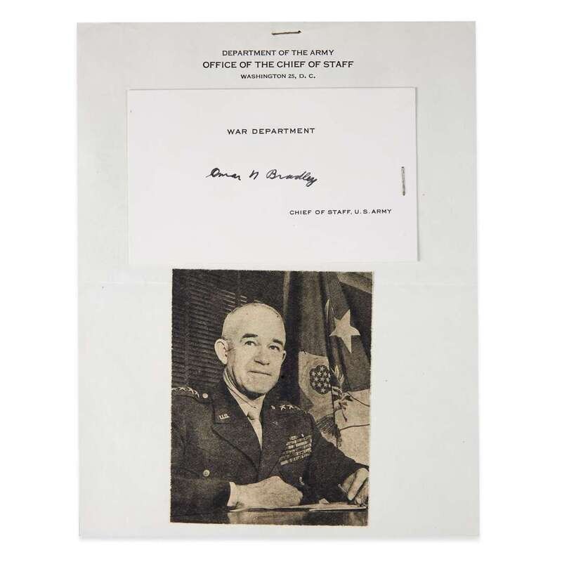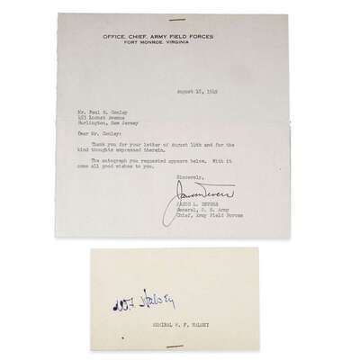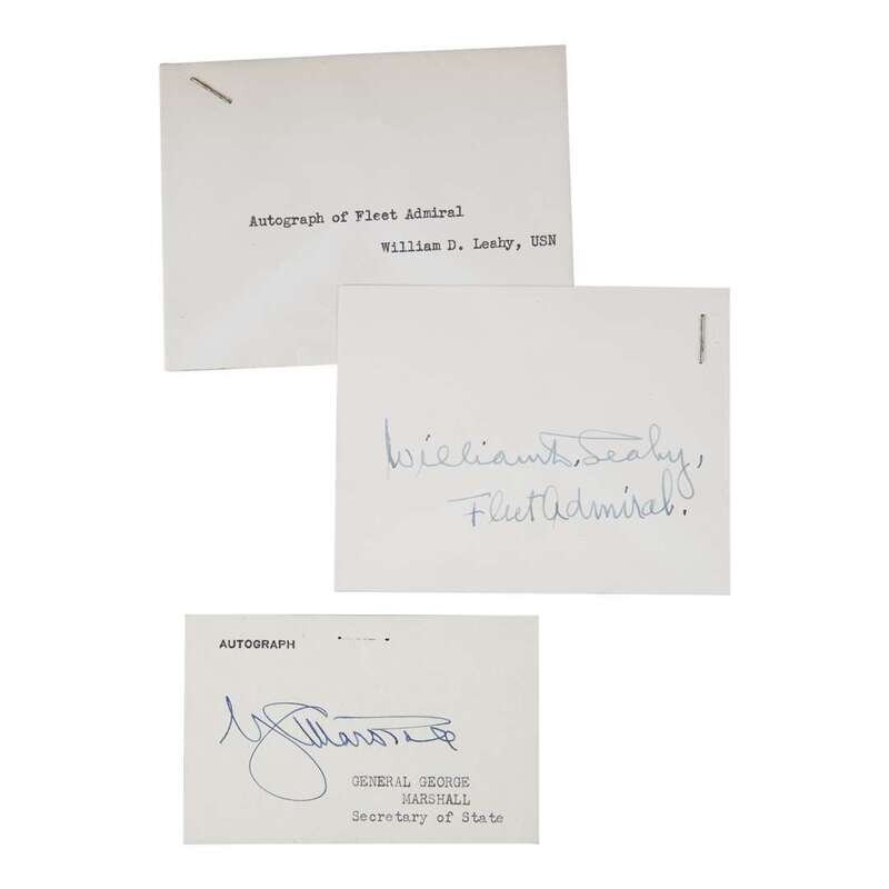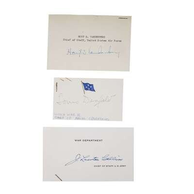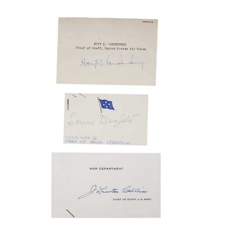Assorted autograph material relating to American military leaders. 20th century. Includes primarily signed cards, other autographs. 17 pieces.