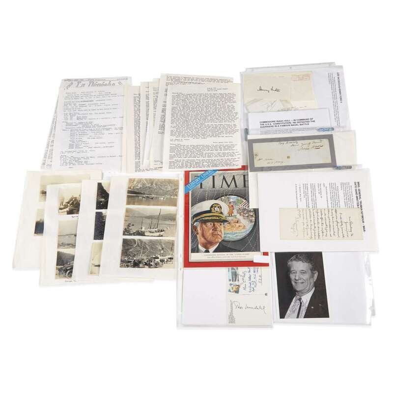 Foss, Joe (Joseph Jacob). U.S. WWII Ace Fighter. Original photograph inscribed, dated "1989," and signed. Hull, Isaac (1773-1843). Commodore, U.S. Navy. Autograph letter closing signed. Heyerdahl, Thor. Post card signed. Macmillan, Donald B. (1874-1970). Arctic Explorer. Biographical pamphlet signed, also signed by Miriam Macmillan. Manning, Commodore Harry. Time Magazine cover signed. Seymour, Brig. General Truman. Manuscript document fragment signed. Near Petersburg, Va., January 25, 1865. Ford, Henry II. Card signed. Iacocca, Lee. Card signed. Lot also includes original photographs (11) relating to WWI.