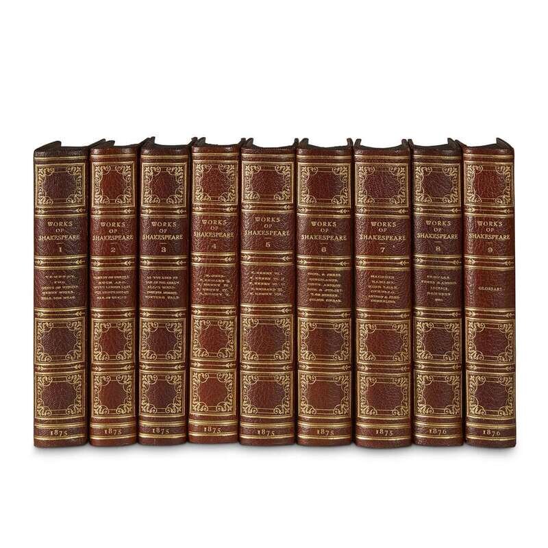 London: Chapman and Hall, 1875-1876. Edited by Alexander Dyce. Third Dyce edition. 8vo. Late 19th or early 20th century full double gilt-fillet paneled brown morocco with foliate and curvilinear gilt inner panels on each cover, gilt-foliate and curvilinear spine compartments, turn-ins gilt, marbled endpapers and edges. Engraved frontispiece portrait of Shakespeare and facsimile plate in volume one. In nine volumes.