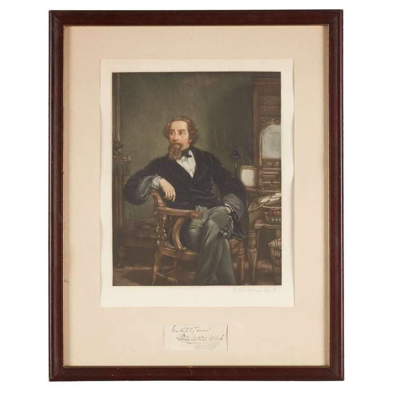 Strong autograph in blue ink. Framed with color-printed mezzotint seated portrait of Charles Dickens signed in pencil by H Blackburn Hart.