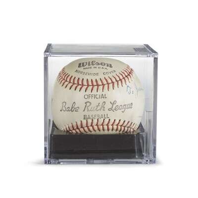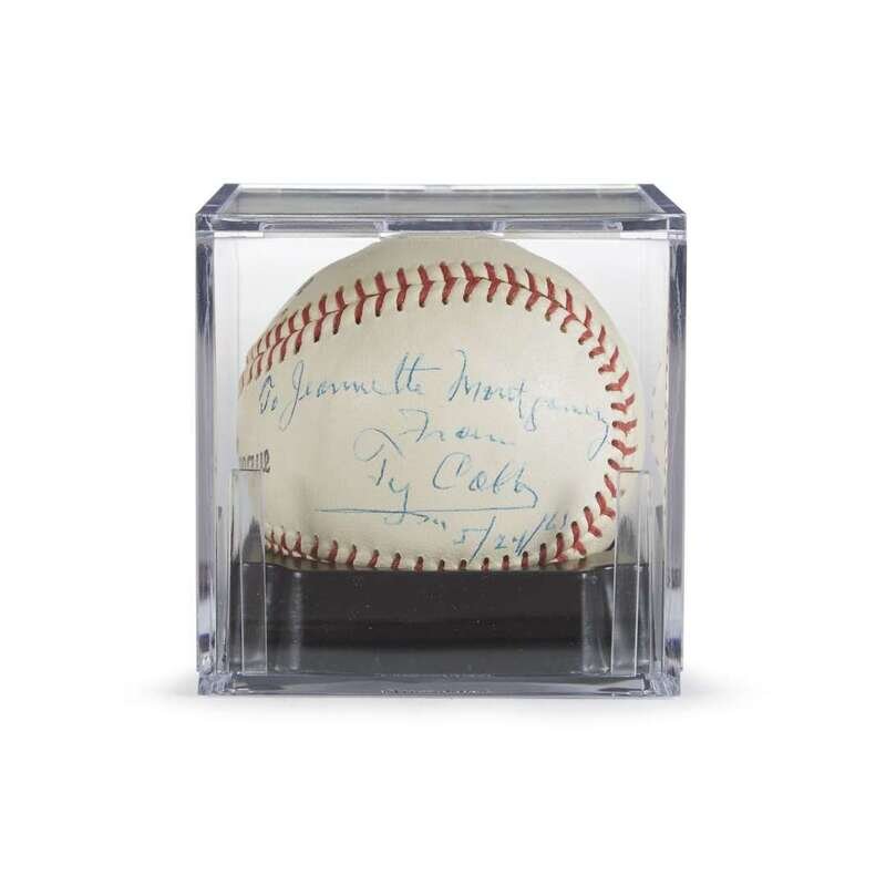 Official Babe Ruth League baseball inscribed to Jeanette Montgomery, dated "5/24/61," and signed in green-blue ink by Ty Cobb. Jeanette Montgomery is the daughter of the then (1961) president of the Atlanta Coca Cola Bottling Company, of which Ty Cobb was a major share holder.