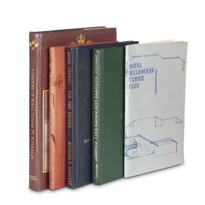 Mursell, Vernon History of The Royal Melbourne Tennis Club, 1881-1974 [Melbourne], [1975]. 8vo. Contemporary brown morocco-backed burgundy cloth. Photo illustrations, plans. Presentation copy inscribed to William J. Clothier (II) and signed by many persons associated with The Royal Melbourne Tennis Club. With book plate of William. J. Clothier (II) on front paste-down. A copy of the preceding in original silver wrappers. Garnett, Michael P. A History of Royal Tennis in Australia (Victoria): Historical Publications, (1983). First edition. 8vo. Original gilt-pictorial and gilt-lettered purple leather, dust jacket. Plates, other illustrations. Garnett, Michael P. Tennis, Rackets and other Ball Games (Victoria), 1986. 8vo. Original gilt-pictorial and gilt-lettered green leather. Illustrations, plans. Garnett, Michael Royal Tennis - For The Record (Melbourne), 1991. 8vo. Original gilt-pictorial and gilt lettered blue-black leather. Illustrated. Presentation copy to Bill [William J.] Clothier (II), inscribed, dated, "January 1992," and signed in ink on the title-page by Michael Garnett.